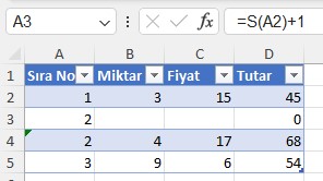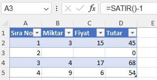 Bu durumdayken tablodan satır silseniz de ekleseniz de sıra no formülleri her zaman doğru sıra numarasını verecektir.